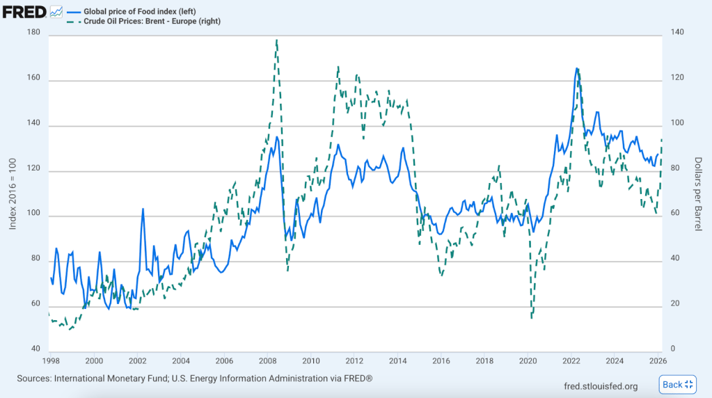 Energy is one of the most critical inputs for the food supply chain, which means the impacts of the war could show up on your grocery receipt. “There’s a very strong correlation between the movement of energy prices and the movement of food prices,” Dr. Ricky Volpe, an agricultural economist and professor of agribusiness at Cal Poly, told Fortune. “We’ve seen oil top $100 a gallon before and that happened to coincide with significant food price inflation.”