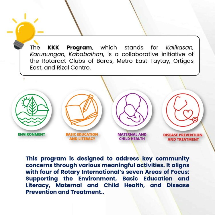 Meet Project KKK — a collaborative effort by the Rotaract Clubs of Baras, Metro East Taytay, Ortigas Center, and Rizal Centro. Built on the pillars of Kalikasan (Environment), Karunungan (Knowledge), and Kababaihan (Women), this program delivers real value to communities across Rizal — and now, it’s looking for forward-thinking partners to scale its impact.